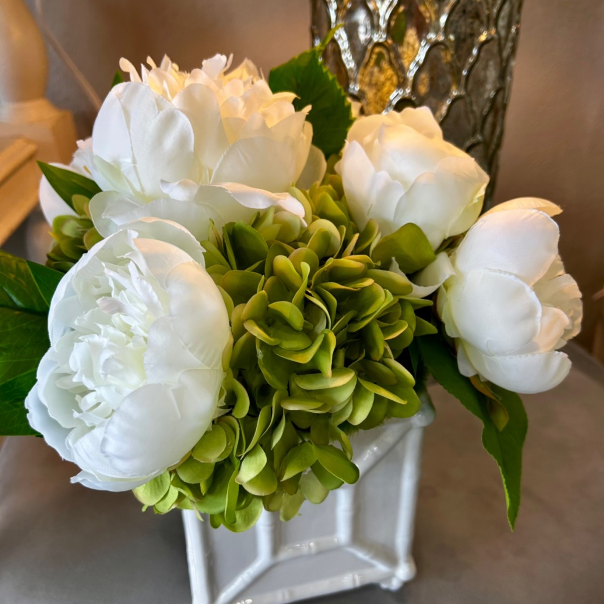 Lovely white faux peonies nestled in realistic green hydrangeas and tucked into the perfect white bamboo cachepot.. Beautiful! Our faux arrangements consist of beautiful, high quality silks that are each custom made by our designers, giving you the feel of fresh flowers from your favorite high end flower boutique. Makes a wonderful gift, or the perfect compliment for your home! Approx. 11" W x 11" H