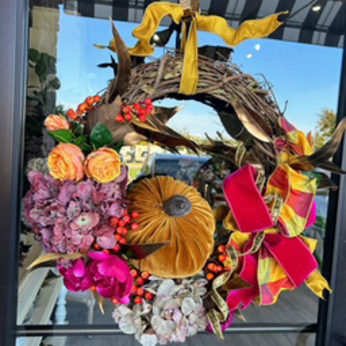Vibrant faux florals, soft gold leaves and berries pair with luxe velvet pumpkins for a swoon worthy wreath ...and of course fabulous ribbon for the designer's touch! Beautiful indoors and recommended outdoors under an awning.